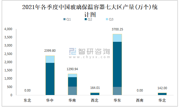 2021年各季度中國玻璃保溫容器七大區產量統計圖