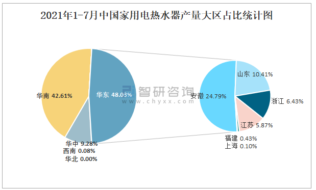 2021年1-7月中國家用電熱水器產量大區占比統計圖