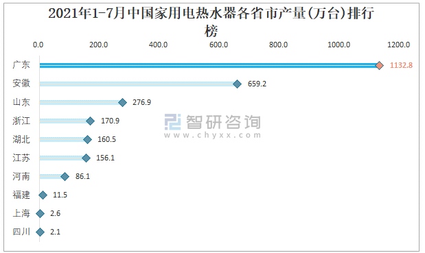 2021年1-7月中國家用電熱水器各省市產量排行榜