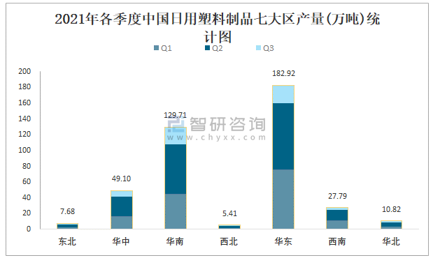 2021年各季度中國日用塑料制品七大區產量統計圖