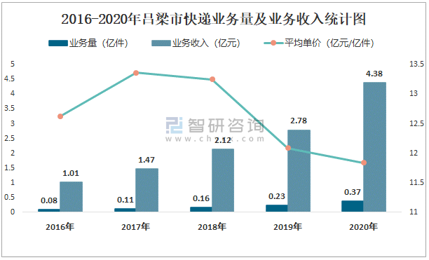 2016-2020年呂梁市快遞業(yè)務(wù)量及業(yè)務(wù)收入統(tǒng)計(jì)圖