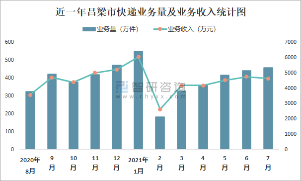 近一年呂梁市快遞業(yè)務(wù)量及業(yè)務(wù)收入統(tǒng)計(jì)圖