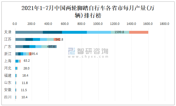 2021年1-7月中國兩輪腳踏自行車各省市每月產量排行榜
