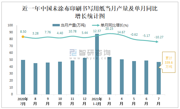 近一年中國未涂布印刷書寫用紙當月產(chǎn)量及單月同比增長統(tǒng)計圖