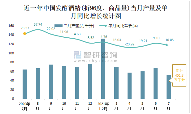 根據國家統計局數據顯示:2021年7月中國發酵酒精(折96度,商品量)產量為52.3萬千升,同比下降16.05%;2021年1-7月中國發酵酒精(折96度,商品量)累計產量為451.8萬千升,同比下降12.13%;2015-2020年中國發酵酒精(折96度,商品量)產量2018年跌至最低,此后逐年遞增。