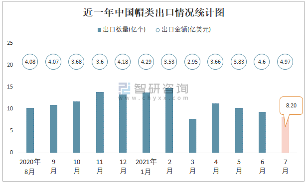 根據中國海關數據顯示:2021年7月中國帽類出口數量為8.2億個,同比下降6.3%,出口金額為4.97億美元,同比增長27.4%;2021年1-7月中國帽類,出口數量為75.29億個,出口金額為27.81億美元。
