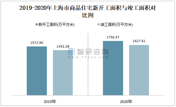 2019-2020年上海市商品住宅新開工面積與竣工面積對比圖