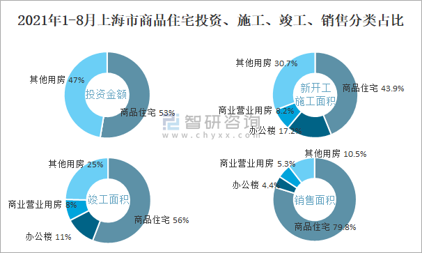 2021年1-8月上海市商品住宅投資、施工、竣工、銷售分類占比