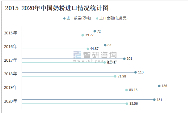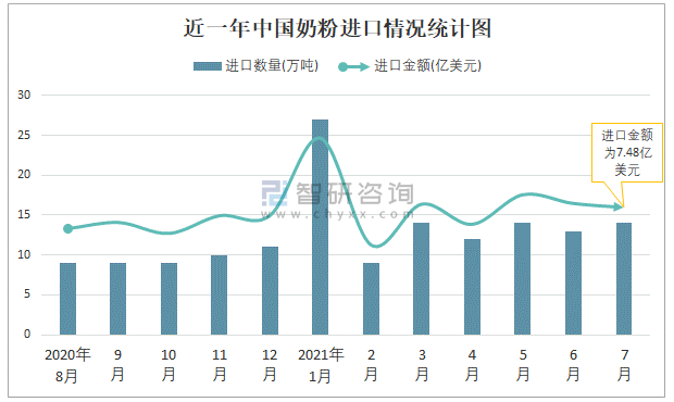 根據中國海關數據顯示:2021年7月中國奶粉進口數量為14萬噸,同比增長33.6%,進口金額為7.48億美元,同比增長11.9%,2021年1-7月中國奶粉進口數量為103萬噸,進口金額為54.37億美元。