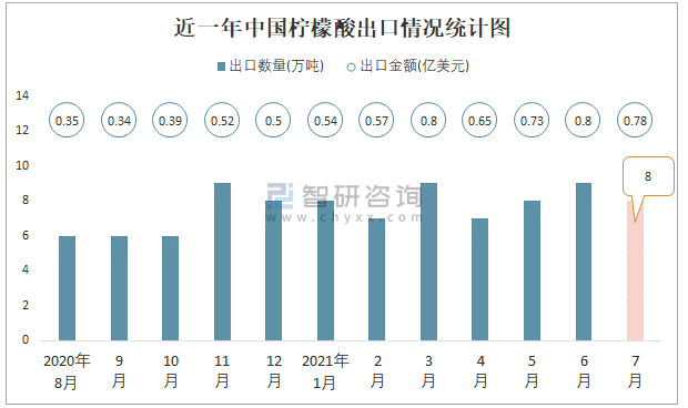 2021年7月中國檸檬酸出口數量和出口金額分別為8萬噸和0.78億美元