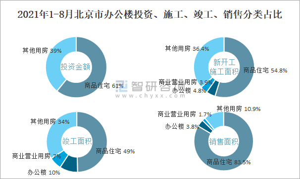2021年1-8月北京市辦公樓投資、施工、竣工、銷售分類占比