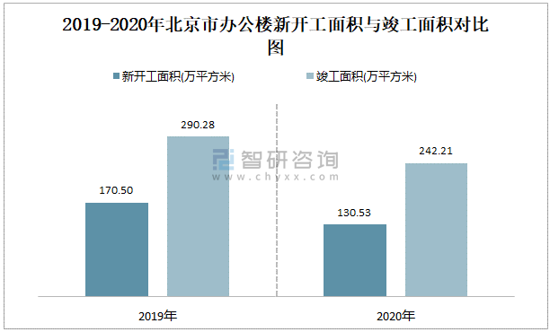 2019-2020年北京市辦公樓新開工面積與竣工面積對比圖