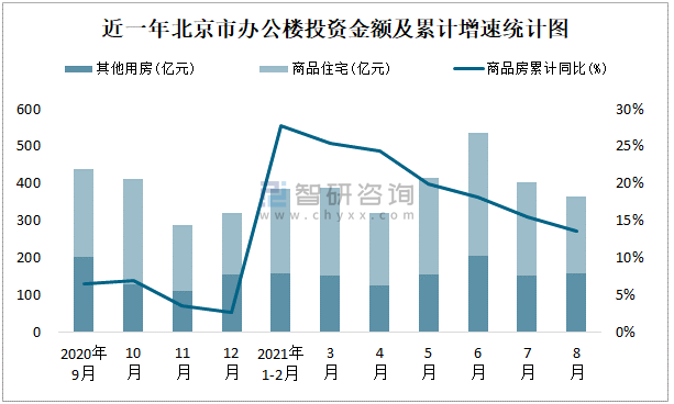 根據國家統計局數據統計可知:2021年8月北京市房地產開發投資商品房投資金額為366.01億元,其中包括辦公樓、商業營業用房等其他用房157.66億元(注:辦公樓、商業營業用房未分開統計);2021年1-8月北京市房地產開發投資包括辦公樓在內的其他用房累計金額為1103.74億元。