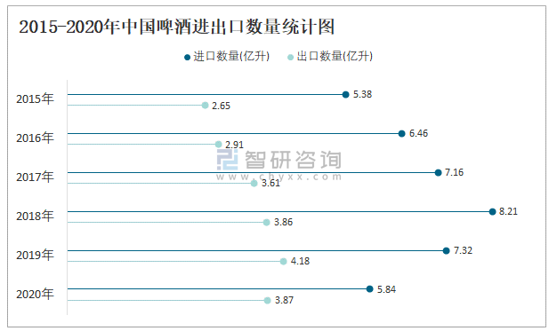 2015-2020年中國(guó)啤酒進(jìn)出口數(shù)量統(tǒng)計(jì)圖