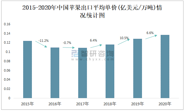 2015-2020年中國蘋果出口平均單價(億美元/萬噸)情況統(tǒng)計(jì)圖