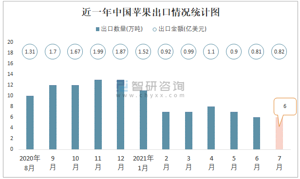據(jù)中國海關(guān)數(shù)據(jù)顯示:2021年7月中國蘋果出口數(shù)量為6萬噸,同比下降5%,出口金額為0.82億美元,同比下降3.5%;2021年1-7月中國蘋果,出口數(shù)量為50萬噸,出口金額為7.04億美元。