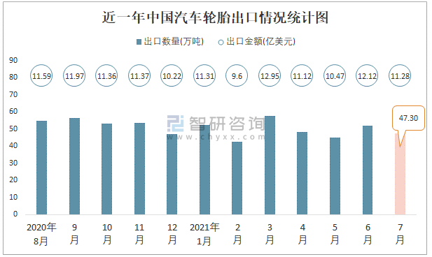 2021年7月中國汽車輪胎進出口數(shù)量分別為1.13萬噸和47.3萬噸