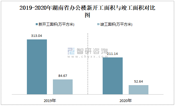 2019-2020年湖南省辦公樓新開(kāi)工面積與竣工面積對(duì)比圖
