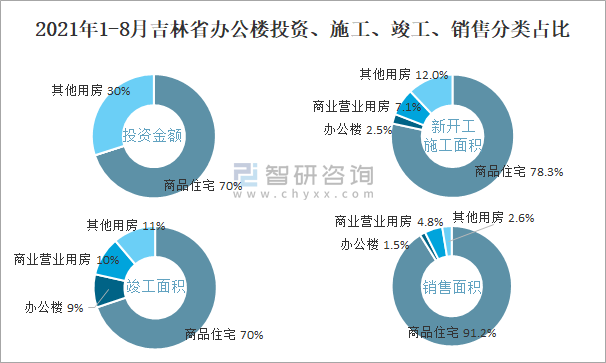 根據國家統計局數據統計可知:2021年1-8月吉林省房地產開發企業在包括辦公樓在內的其他用房投資金額占比為30%(注:只有投資金額中其他用房包含辦公樓、商業營業用房),辦公樓的新開工面積與竣工面積所占比重差異不大,從銷售面積來看,辦公樓銷售面積占比少于商業營業用房銷售面積占比。