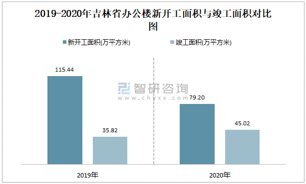 2019-2020年吉林省辦公樓新開工面積與竣工面積對比圖