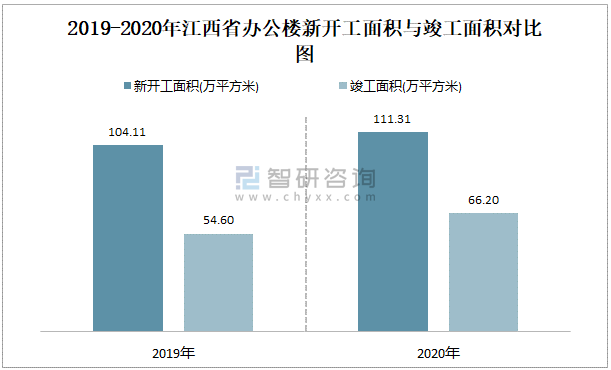 2019-2020年江西省辦公樓新開工面積與竣工面積對比圖