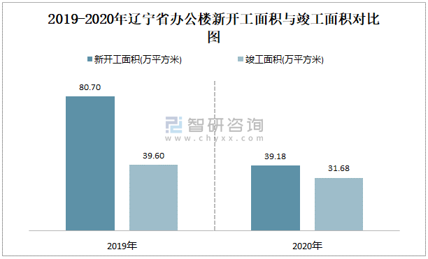 2019-2020年遼寧省辦公樓新開工面積與竣工面積對比圖