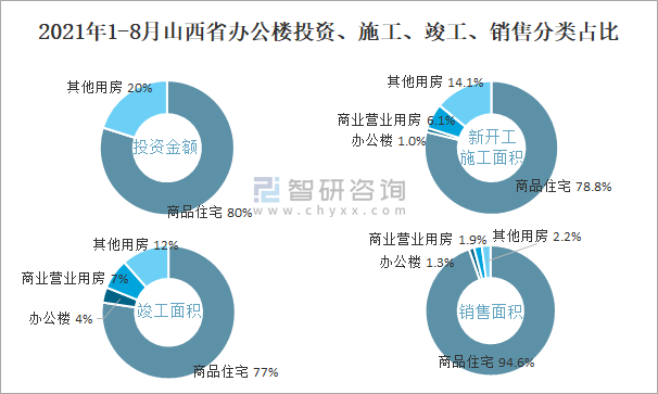 根據(jù)國家統(tǒng)計局?jǐn)?shù)據(jù)統(tǒng)計可知:2021年1-8月山西省房地產(chǎn)開發(fā)企業(yè)在包括辦公樓在內(nèi)的其他用房投資金額占比為20.1%(注:只有投資金額中其他用房包含辦公樓、商業(yè)營業(yè)用房),辦公樓的新開工面積與竣工面積所占比重差異不大,從銷售面積來看,辦公樓銷售面積占比少于商業(yè)營業(yè)用房銷售面積占比。