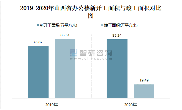 2019-2020年山西省辦公樓新開工面積與竣工面積對比圖
