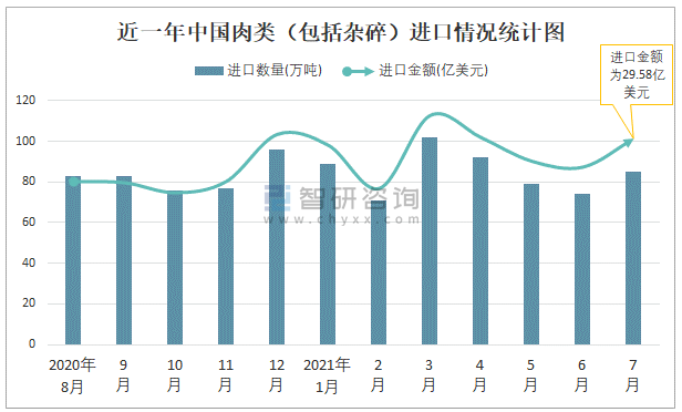 根據中國海關數據顯示:2021年7月中國肉類(包括雜碎)進口數量為85萬噸,同比下降14.4%,進口金額為29.58億美元,同比增長1.9%,2021年7月中國肉類(包括雜碎)出口數量為3萬噸,同比下降3.3%,出口金額為1.51億美元,同比增長5.9%;2021年1-7月中國肉類(包括雜碎)進口數量為593萬噸,進口金額為195.05億美元,出口數量為18萬噸,出口金額為9.7億美元。
