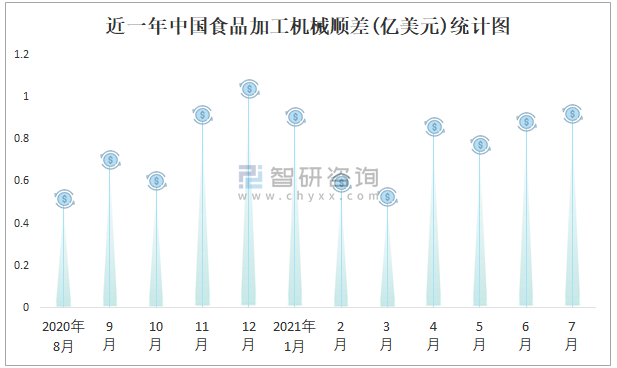 近一年中國(guó)食品加工機(jī)械順差(億美元)統(tǒng)計(jì)圖
