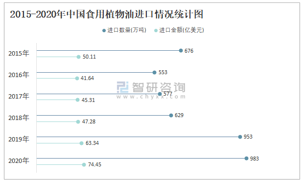2015-2020年中國食用植物油進口情況統(tǒng)計圖