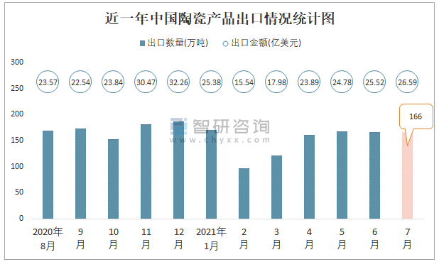 根據中國海關數據顯示:2021年7月中國陶瓷產品出口數量為166萬噸,同比下降0.8%,出口金額為26.59億美元,同比增長3.2%;2021年1-7月中國陶瓷產品,出口數量為1050萬噸,出口金額為159.55億美元。