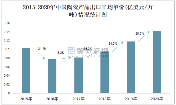 根據中國海關數據顯示:2015-2020年中國陶瓷產品出口數量逐年遞減,出口金額2016年跌至最低值,此后逐年遞增;2015-2020年中國陶瓷產品出口平均單價2019年增長速度最快,而2016年中國陶瓷產品出口平均單價下降速度最快,下滑了24.4%,跌至最低值。