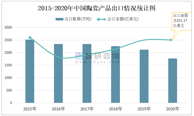 2015-2020年中國陶瓷產品出口情況統計圖