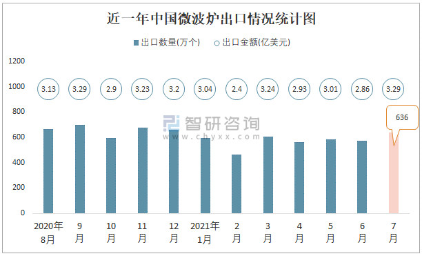 根據(jù)中國海關數(shù)據(jù)顯示:2021年7月中國微波爐出口數(shù)量為636萬個,同比增長1.2%,出口金額為3.29億美元,同比增長11%;2021年1-7月中國微波爐,出口數(shù)量為4014萬個,出口金額為20.77億美元。