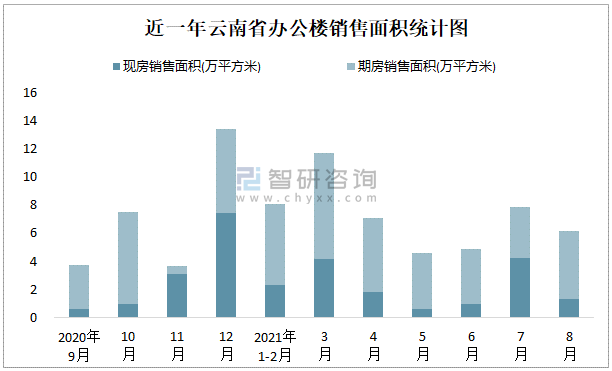 2021年8月云南省辦公樓銷售面積為6.18萬平方米(現房銷售面積占比21.52%)