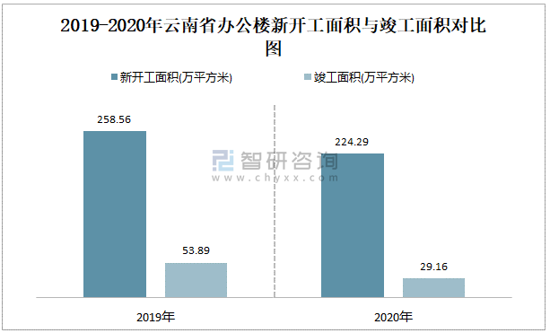 2019-2020年云南省辦公樓新開工面積與竣工面積對比圖