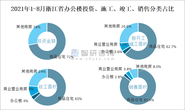 2021年1-8月浙江省辦公樓投資、施工、竣工、銷售分類占比