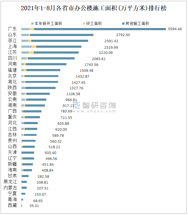 2021年1-8月各省市辦公樓施工面積(萬平方米)排行榜