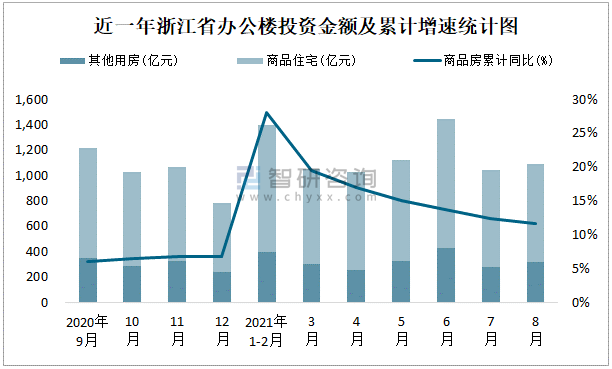 根據(jù)國家統(tǒng)計局數(shù)據(jù)統(tǒng)計可知:2021年8月浙江省房地產(chǎn)開發(fā)投資商品房投資金額為1093.43億元,其中包括辦公樓、商業(yè)營業(yè)用房等其他用房314.54億元(注:辦公樓、商業(yè)營業(yè)用房未分開統(tǒng)計);2021年1-8月浙江省房地產(chǎn)開發(fā)投資包括辦公樓在內(nèi)的其他用房累計金額為2308.05億元。