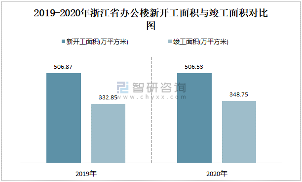 2019-2020年浙江省辦公樓新開工面積與竣工面積對比圖