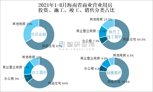 根據國家統計局數據統計可知:2021年1-8月海南省房地產開發企業在包括商業營業用房在內的其他用房投資金額占比為33%(注:只有投資金額中其他用房包含辦公樓、商業營業用房),商業營業用房的新開工面積與竣工面積所占比重差異不大,從銷售面積來看,商業營業用房銷售面積占比高于辦公樓銷售面積占比。