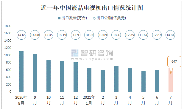 近一年中國(guó)液晶電視機(jī)出口情況統(tǒng)計(jì)圖