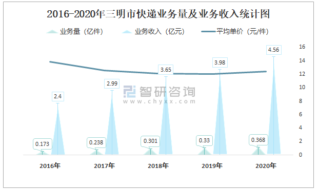 2016-2020年三明市快遞業務量及業務收入統計圖