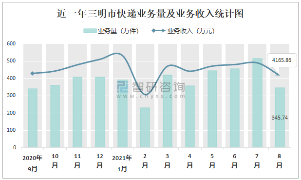 2021年8月三明市快遞業務量與業務收入分別為345.74萬件和4165.86萬元