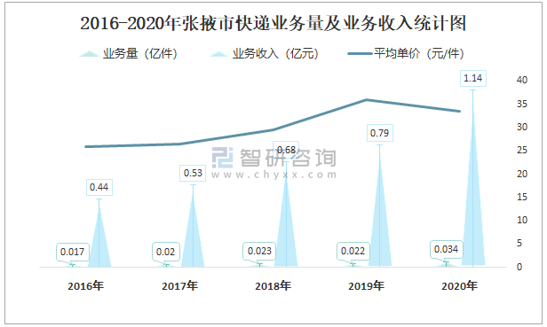 2016-2020年張掖市快遞業務量及業務收入統計圖