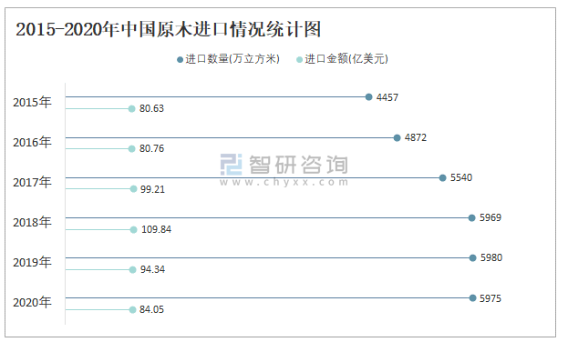 2015-2020年中國(guó)原木進(jìn)口情況統(tǒng)計(jì)圖
