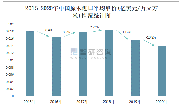 2015-2020年中國(guó)原木進(jìn)口平均單價(jià)(億美元/萬(wàn)立方米)情況統(tǒng)計(jì)圖
