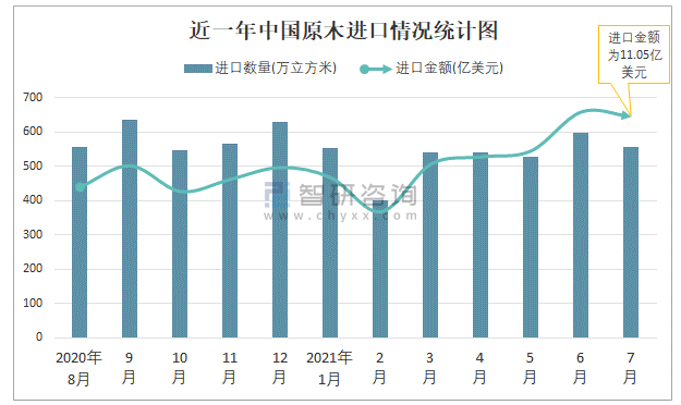 根據(jù)中國(guó)海關(guān)數(shù)據(jù)顯示:2021年7月中國(guó)原木進(jìn)口數(shù)量為555萬(wàn)立方米,同比下降6.4%,進(jìn)口金額為11.05億美元,同比增長(zhǎng)28.4%,2021年1-7月中國(guó)原木進(jìn)口數(shù)量為3716萬(wàn)立方米,進(jìn)口金額為63.7億美元。