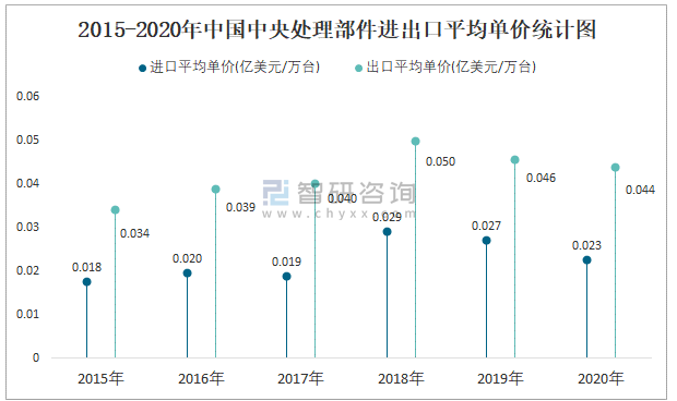 2015-2020年中國中央處理部件進出口平均單價統(tǒng)計圖